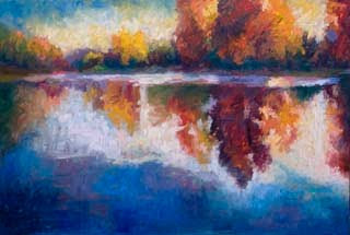 This painting is inspired by one of my favorite spots just ten minutes from our home in Dallas. It was a perfect autumn day – about 70° with a slight breeze and the peaking autumn colors were more vibrant than usual. With such a gentle wind, the vivid foliage and gorgeous fluffy clouds were reflected fairly clearly in the water and yet at the same time, I chose to create fluid moving strokes to suggest the peaceful energy in that moment.