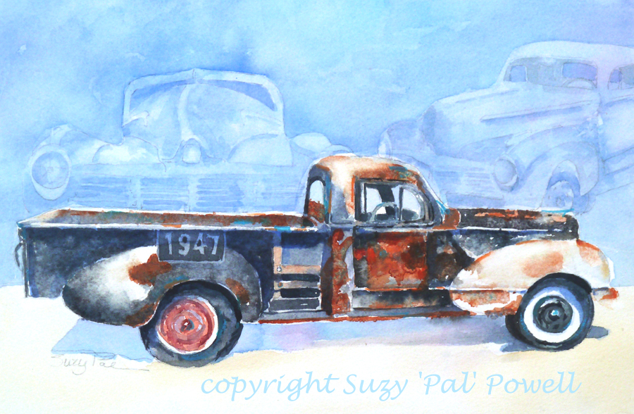 I was ask by a friend to do her husband's old 1947 Hudson Pick up for his Birthday. I never heard of Hudson pick ups! She sent some photos, and I searched online to see what they looked like. I am looking forward to seeing it after he is through restoring it. This is the way it looks now, or the way it was when he got it. I wasn't sure how to do it, so I decided to negative paint the images in the background, and decided for future reference added the year. I know it will be beautiful when it is finished.