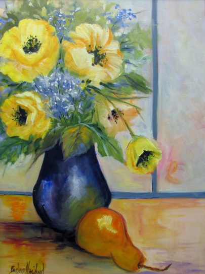 This floral still has such a lovely composition, with bright flowers sprinkled in a shimmery, reflective vase. Yellows, greens, oranges and blues make this a wonderful painting that goes with both contemporary and traditional décor.